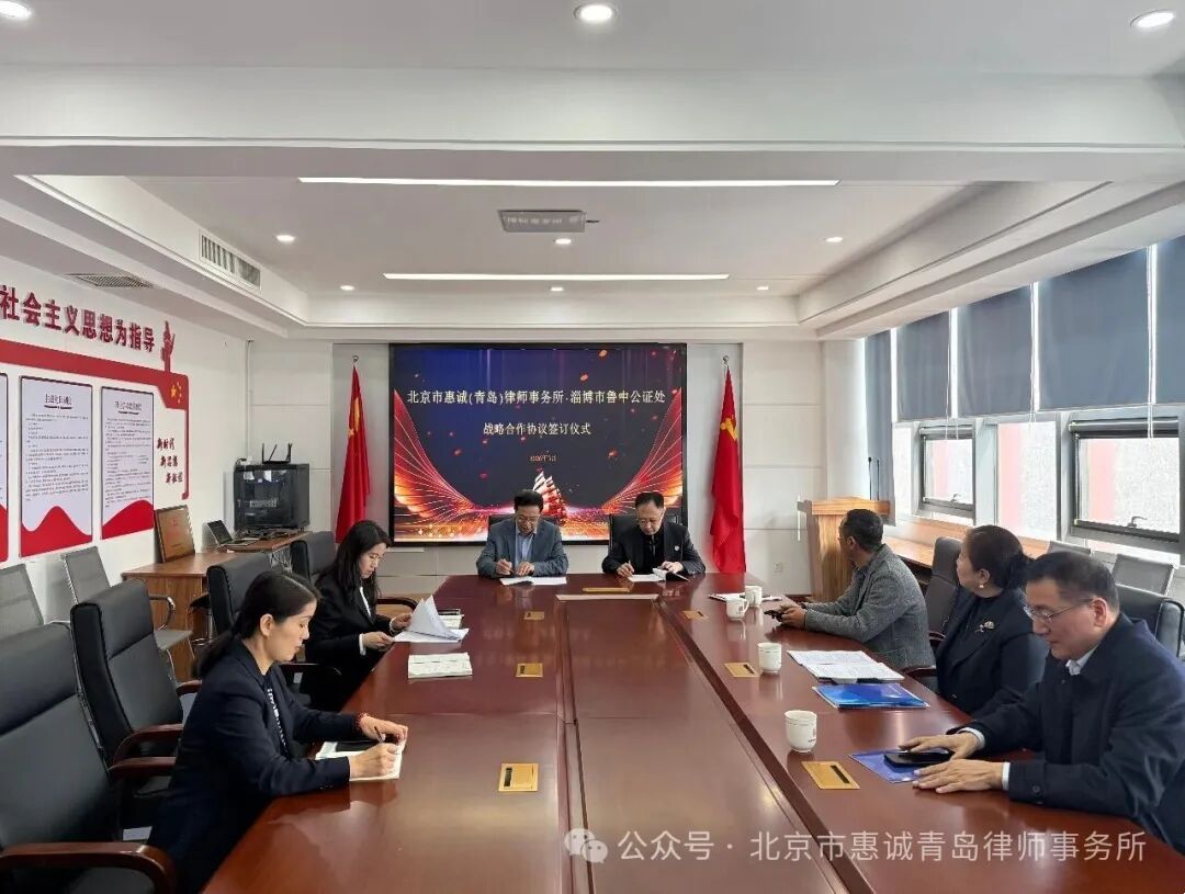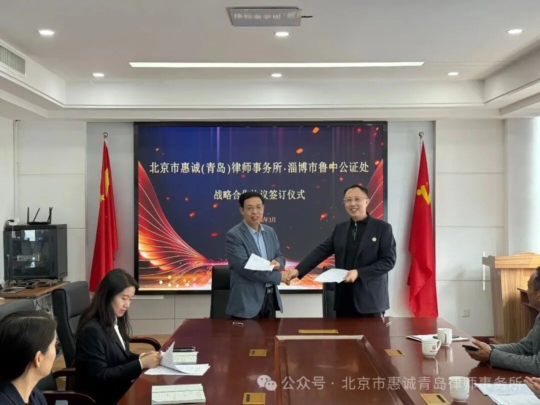 3月24日,惠诚青岛律师所魏剑啸主任代表本所与鲁中公证处正式签订战略合作协议。